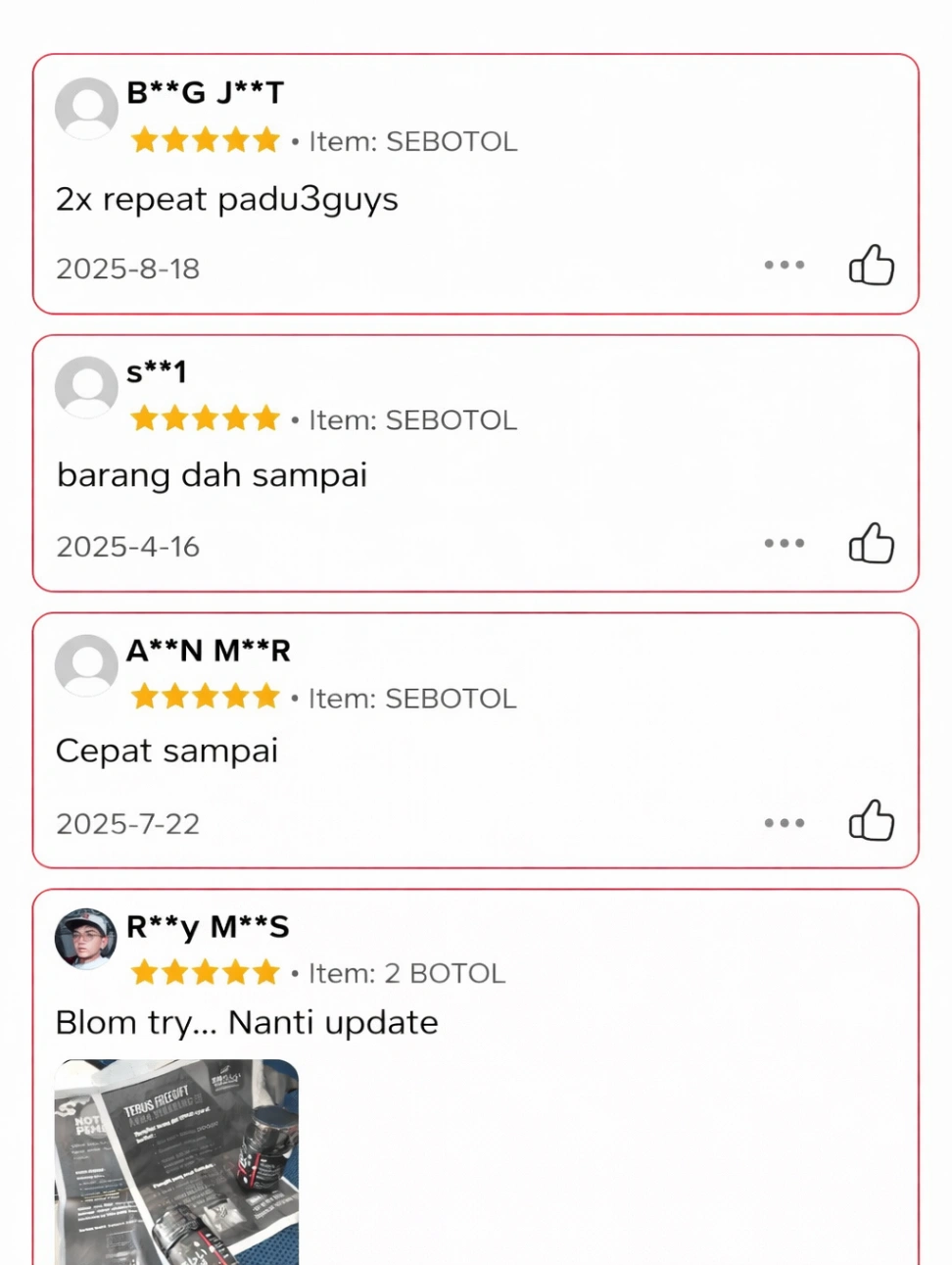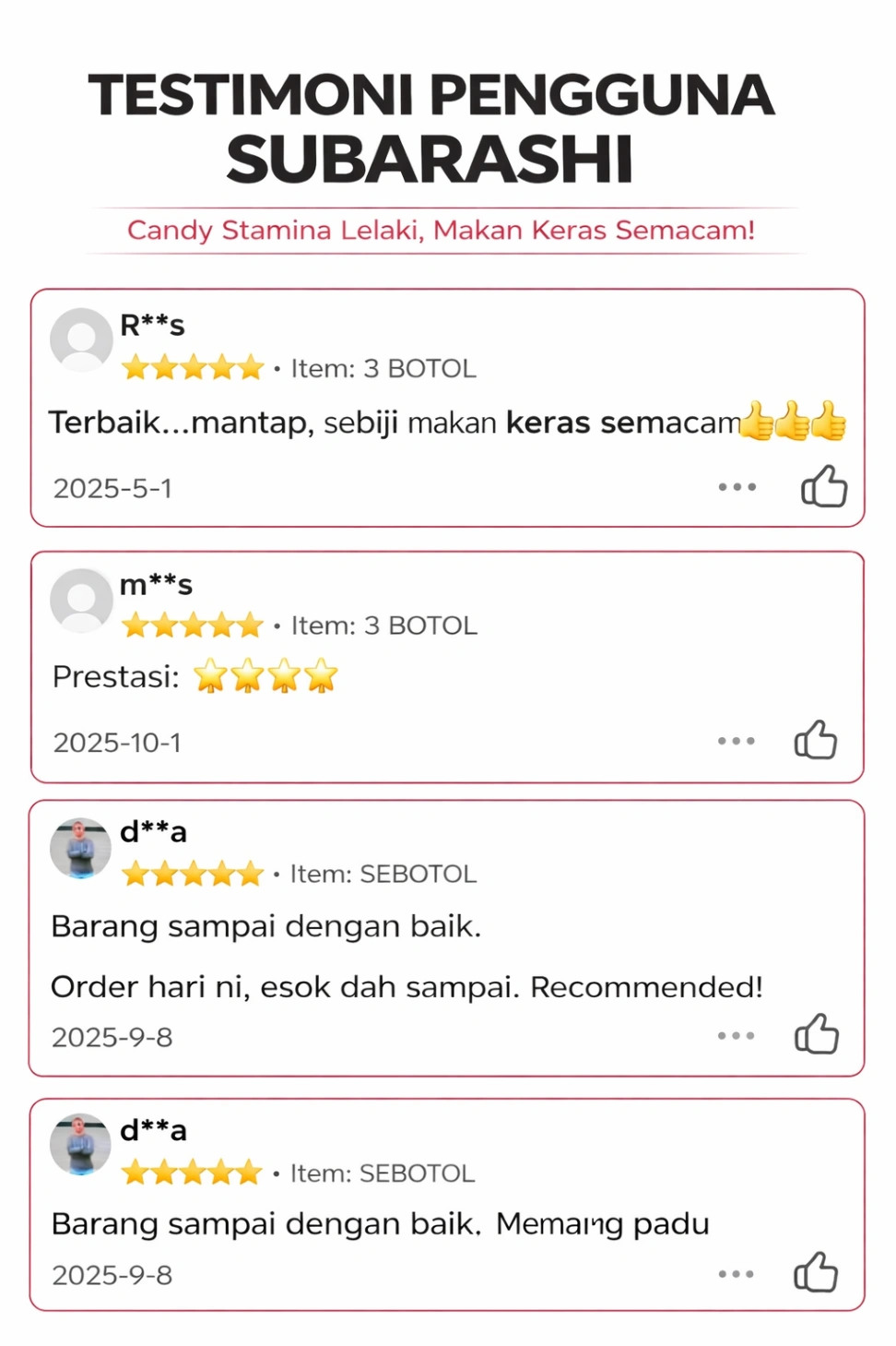 - Abang Sham, 42 Tahun"Awal-awal ragu juga, lepas try 1 biji memang rasa beza dia. Keras dia lain macam. Trusted seller!"